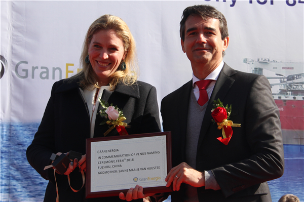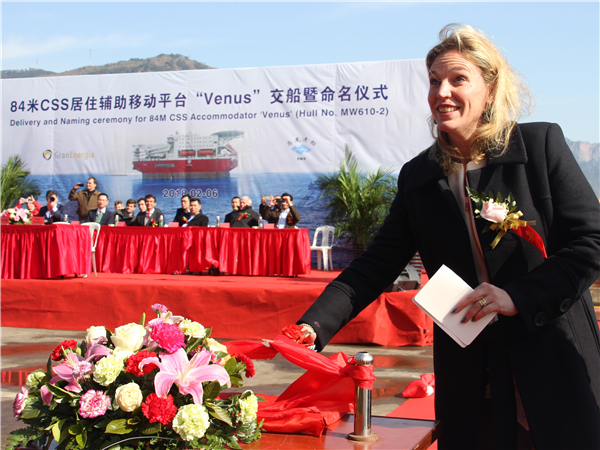 Venus Shipping公司董事夫人、教母Sanne Marije van Huijstee女士接受由Miguel Gradin先生赠送的教母纪念匾额,将该船命名为“Venus”,并开启香槟。