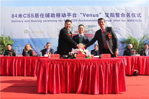本报讯 2月6日上午,马尾造船公司举行84米双体半潜自航式居住辅助平台“Venus”(MW610-2)交船暨命名仪式。Gran Energia公司,Venus Shipping公司,船政海外公司,ABS船级社等领导和嘉宾出席仪式。