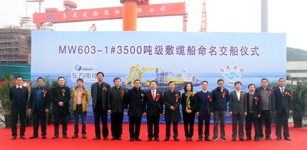 本报讯 2月26日上午(正月十一),马尾造船公司在新年开工第一天,举行3500吨级敷缆船“东方海工01”(MW603-1)交船命名仪式。宁波东方集团有限公司、宁波东方电缆股份有限公司、宁波海缆研究院工程有限公司,CCS船级社及福船集团领导和嘉宾出席仪式。