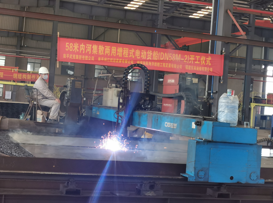 3月31日,福船集团电动船研制总装基地福宁重工为南平闽江航运发展有限公司建造的两艘58米内河集散两用货船(DN58M-1#/2#)顺利开工,其中DN58M-1为58米内河集散两用常规柴油动力货船,DN58M-2为58米内河集散两用增程式电动货船。
