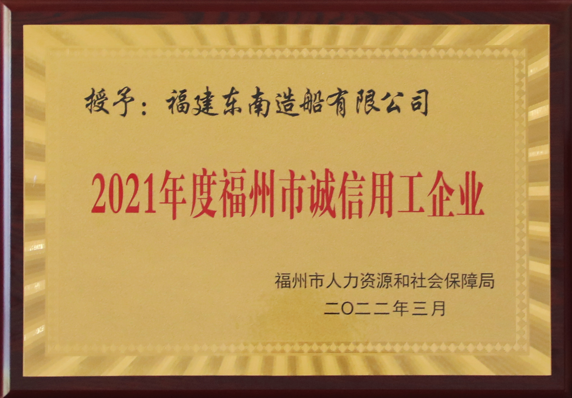 东南造船荣获2021年度福州市“诚信用工企业”称号